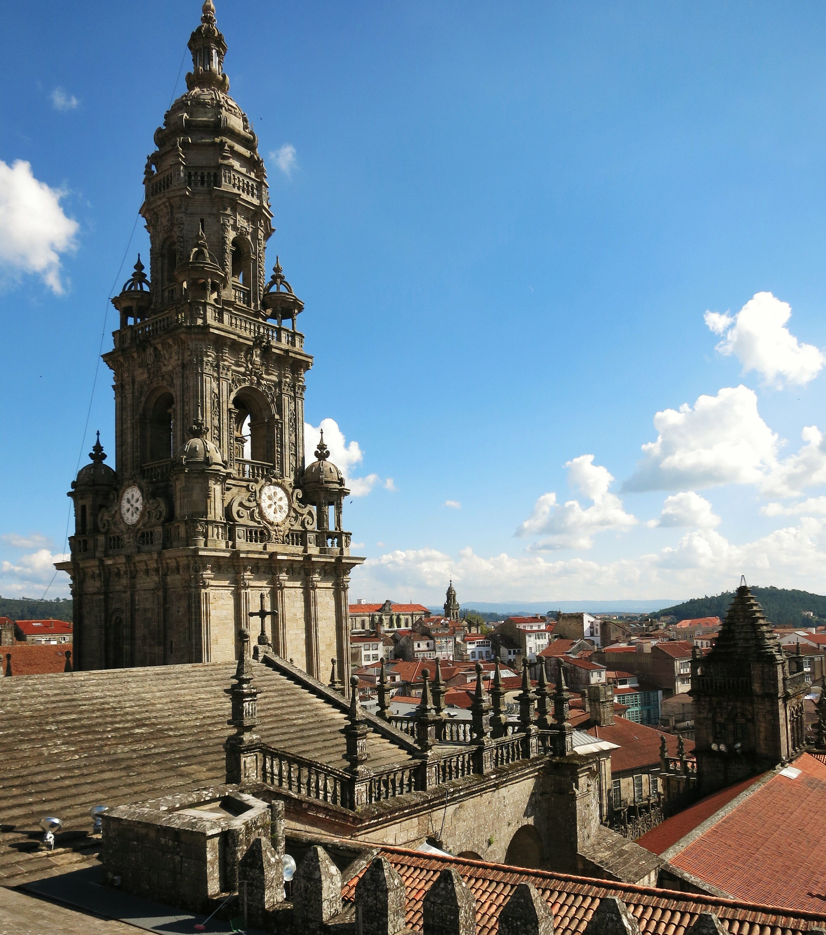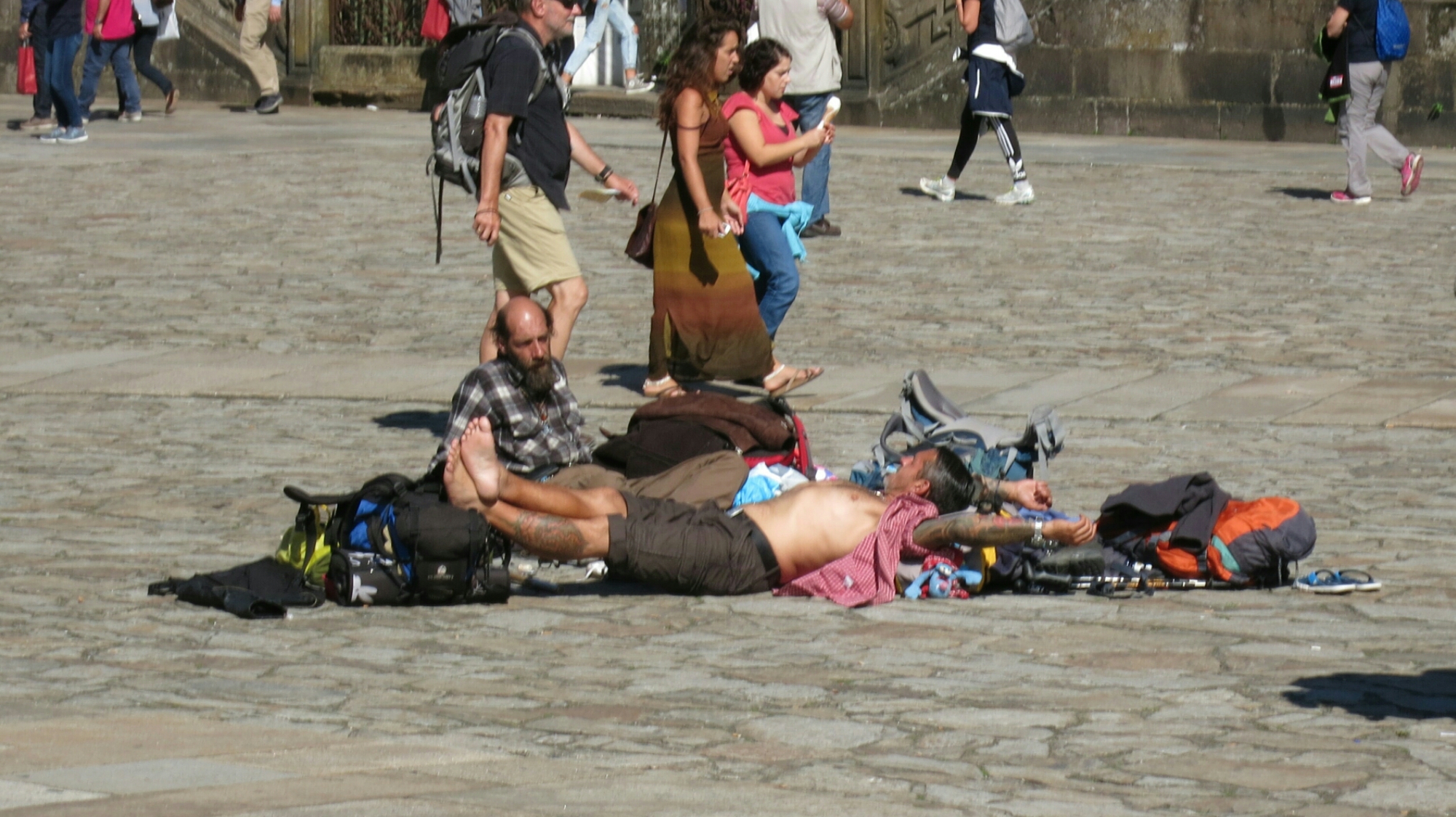 We had bought tickets for a tour of the Cathedral museum and roof. The only one available was the Spanish version at 4:00 but it was our last chance so we went for it. As we came out from getting tickets we came on these tired Peregrinos in the main square.